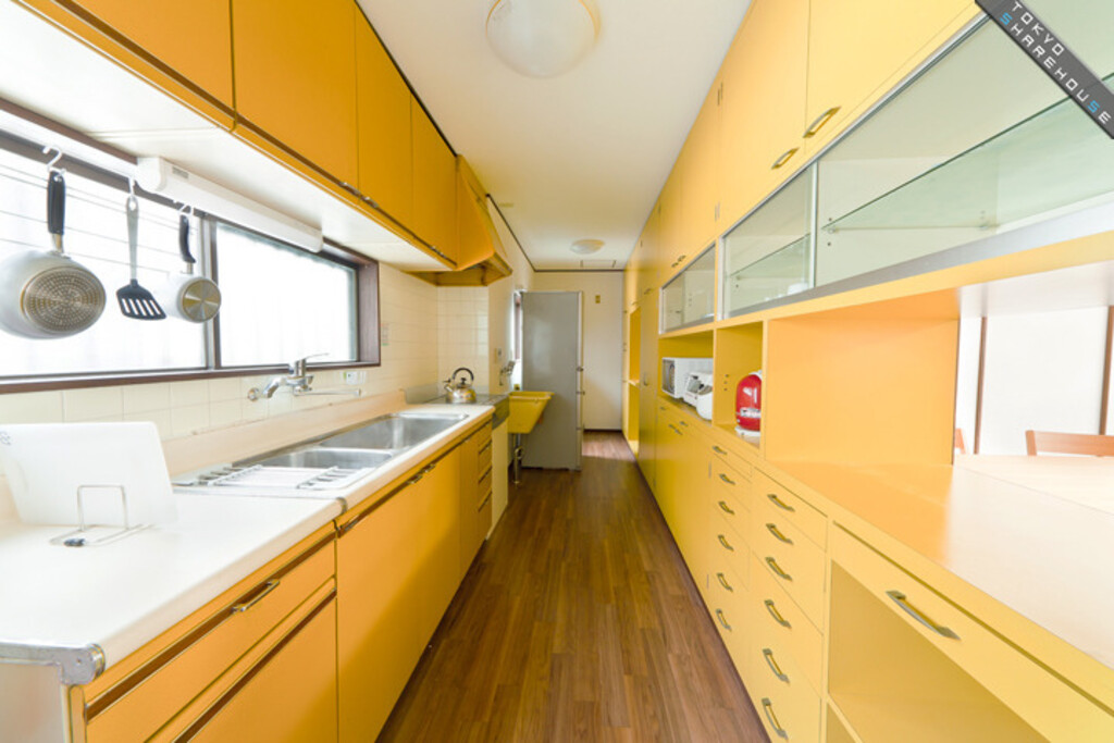 We're now in the kitchen (picture provided by the manager). Connected to the living room, you're sure to spark conversation while cooking. Even though residents are learning English, there's no need to be sitting at a table like in a school, so residents can talk in English while cooking, gaining experience while having fun.
