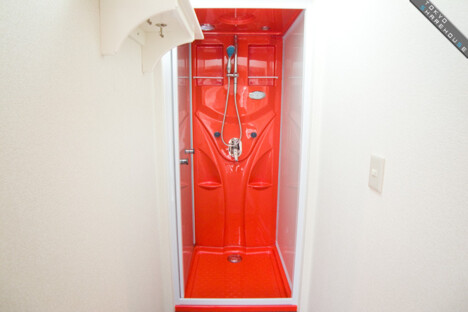 Further inside past the kitchen, there's a bright red shower room with a very modern design.
