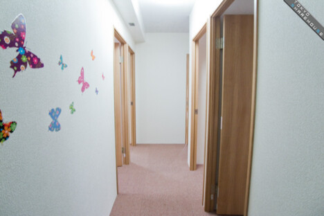 Here's a look at the 3rd floor and the other resident's rooms. The wall has a vibrant print of butterflies fluttering about.