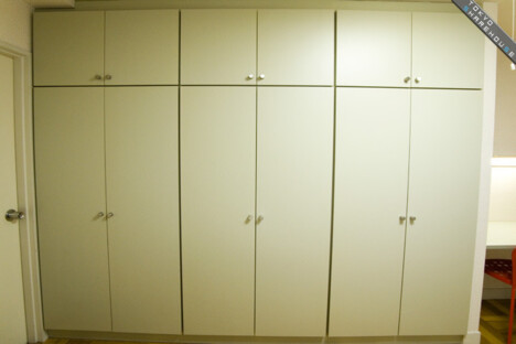 The desks which can be found in every room seem to be custom made and are a part of the wall. Because the desk is place along the wall, you can not only make effective use of your room's space, but it also has a very clean look. I like how it casually blends into the room.