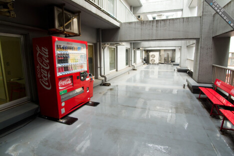 This is the free space located on the outside of the dining room. The bright red vending machine is quite impressive, but it seems to be a unique area inside the building where one can smoke. Perhaps this is a place for those who smoke to get together.