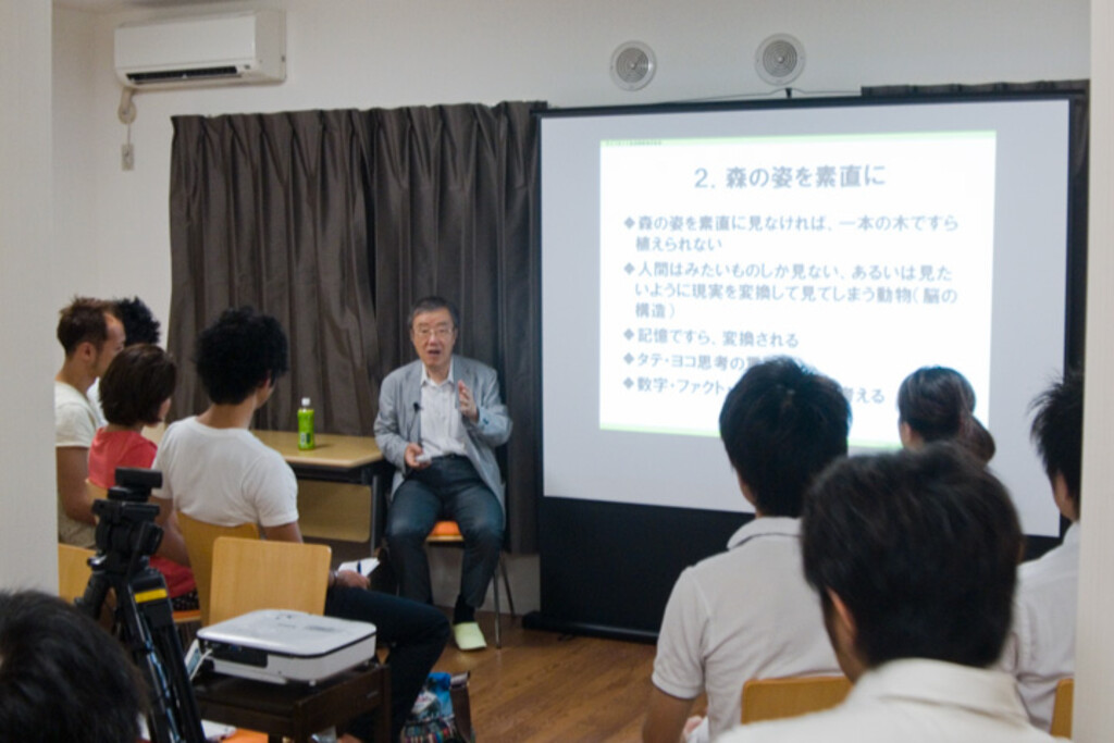 Now for the event. As we entered the conference room, preparations were well underway. The theme for the seminar was "A way of life for the next generation," and the lecture was conducted by Haruaki Deguchi from the Lifenet insurance company.