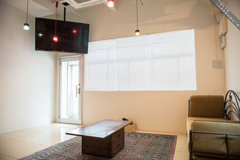 Turn around from the dining room to find the living area. The thin television suspended from the ceiling adds to the unusual interior.
