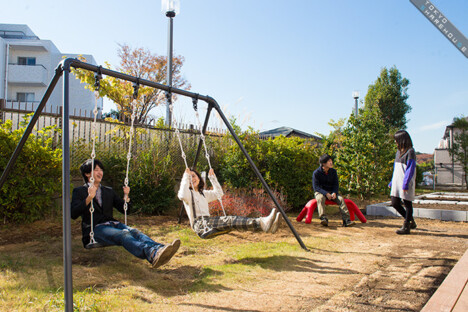 Beside the vegetable patch is a small playground with a swing set and horizontal bar. It's almost like a public park.