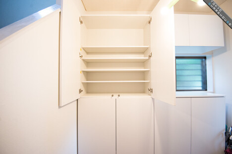 These brand new cupboards were put in with the renovations. There is also a shelf for boots.