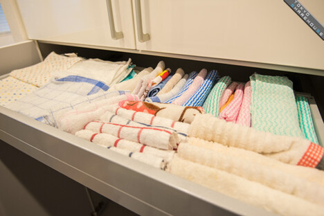New shelving has been put in with plenty of room for each tenant to use. The tea towels are folded away nicely in this drawer.