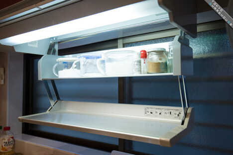 Pull down the cover behind the light to find a shelf for storing spices and things. When not in use everything is stored away nicely out of sight.