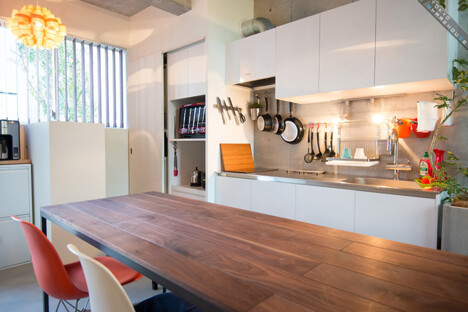 The interior has great natural light with rooms bright enough during the day that you don't need to turn on the lights. There are two communal areas for the tenants to gather in, and the dining room table uses the difference in floor height to its advantage to create to different environments, one for sitting on the floor and relaxing and the other for more active tasks such as cooking and cleaning.