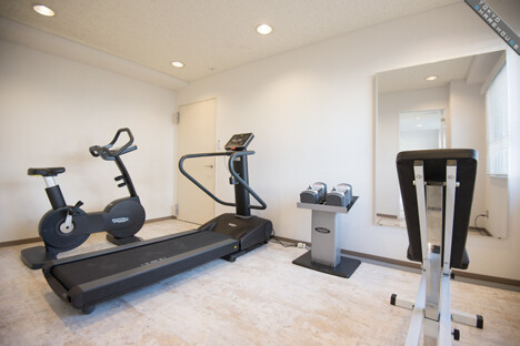 The fitness room is at the back of the entrance hall. Residences can work out with the dumbbells or on the exercise bike.
