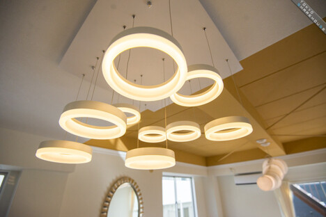 The unique lighting fixtures accentuate an otherwise simple interior.