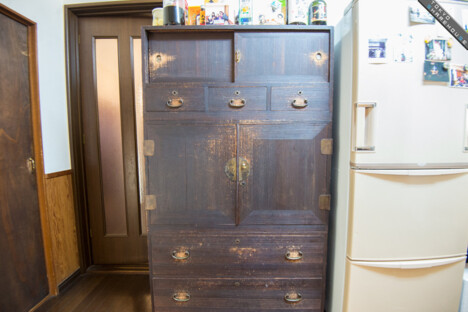 Homemade plum wine sits above an elegant shelf, no doubt put to use at the frequently held parties in the house.
