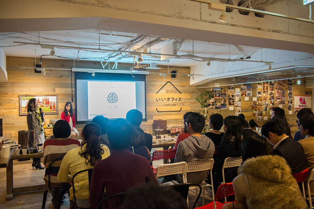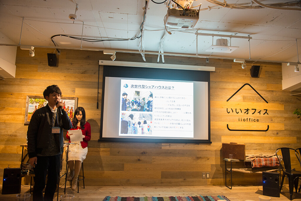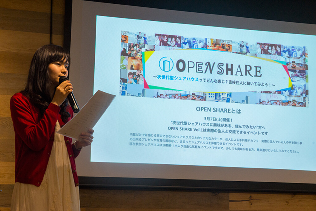 The proceedings begin with an introduction about OPEN SHARE from Ayuko Fukusawa, an announcer for「SHAREHOUSE.TV」, a news media outlet run by our company. She is also acting as MC for the night and works the crowd with ease. At last, the event begins.
