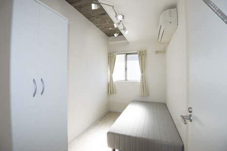 Rooms are simple in design and ready to be arranged as residents please. Each room contains a bed and simple storage unit and has a fresh white color scheme. (Room A)