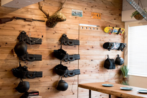 Laser tag equipment and skateboards hang on the wall here. Anyone up for a game?