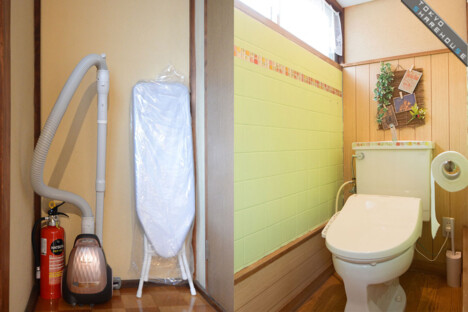 The tiles in the toilet were DIY upgraded to their current bright color by the manager. Beside the toilet is the vacuum cleaner and ironing board, both free to use for residents.
