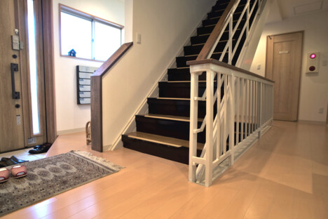 There is a staircase to the left past the entryway. The door in the back is the 1F toilet.