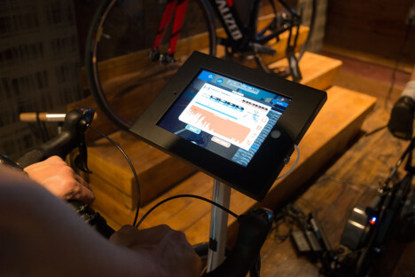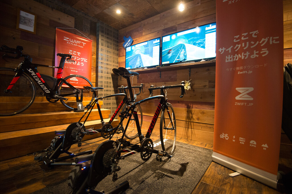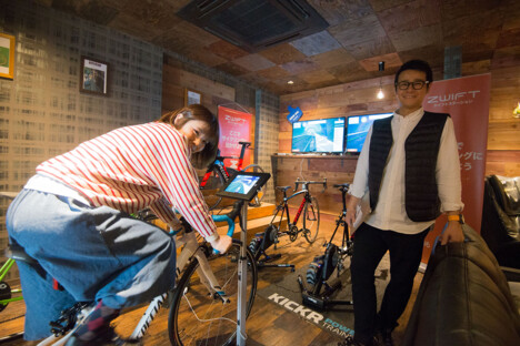 You have the opportunity to train with the 'ZWIFT', a road bike that's currently really popular overseas. When you actually try out the bike, you'll see that an avatar on the display screen that, from the training room, makes it feel like your cycling outside in the real world. Distance and speed are, of course, monitored on the screen as well, and internet connection allows you to race other ZWIST players online in real time. Technology like this could be really useful in snowy regions where outdoor racing is difficult.