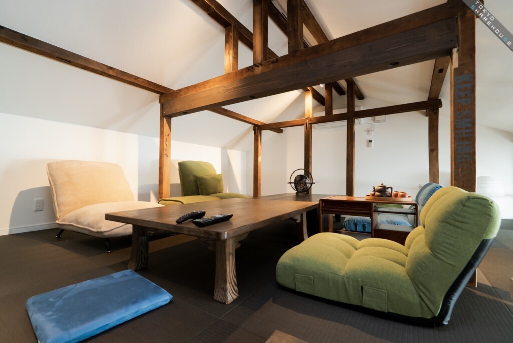 ・和風ロフトには55インチ大型TVも設置。騒音配慮のため、共有スペースでのTV視聴は極力22時までにと制限されているそうです。(撮影角度では見えず、すみません。この角度とは反対側にTV設置あり。)