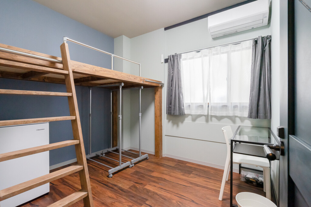 1Fのお部屋はロフトベットが備え付けられているので、収納スペースも広々。ハンガーラックもお部屋に備え付けられています。