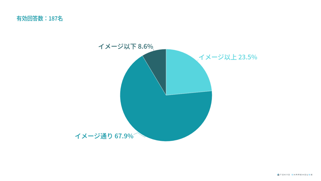 シェアハウス経験者の方に伺った「『プライバシー確保』に関する入居前後のイメージのギャップ」のグラフを見ると、「イメージ以下」と答えているのは全体の8.6%でした。