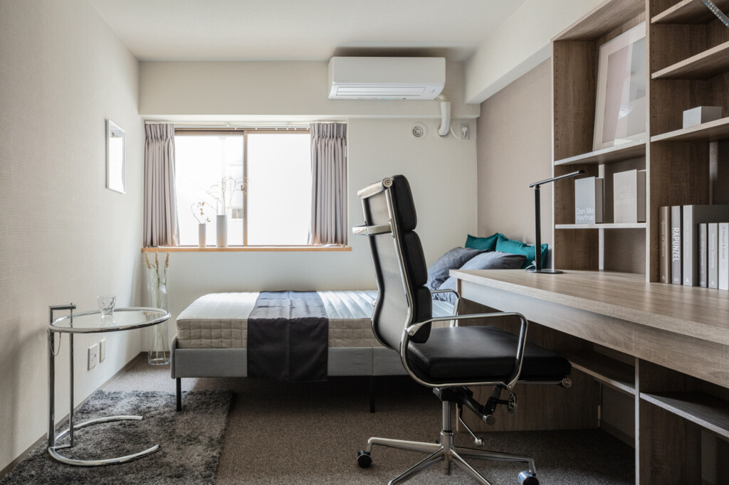 通常はシングルベッドのところが、セミダブルになっており、テーブルには、本や資料などがたくさん保管できる大きな棚が。椅子も通常のお部屋よりも高価なものを入れ、在宅ワークにも嬉しいお部屋となっています。