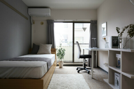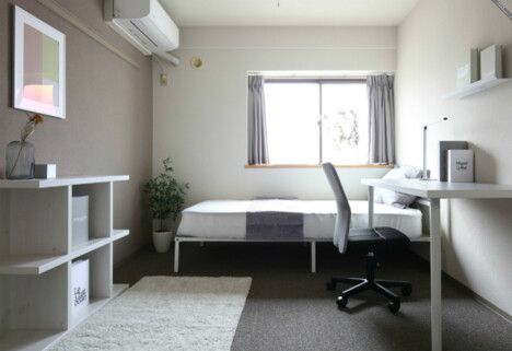 広さはすべて同じで、9.7㎡。全室にベッド、マットレス、机、椅子、Wifi、カーテン、エアコン、洋服もかけられるウォールシェルフを設置。冷蔵庫は2階のお部屋のみの設置で、その他のお部屋にはありませんが、毎月2,000円で追加することも可能だそうです。