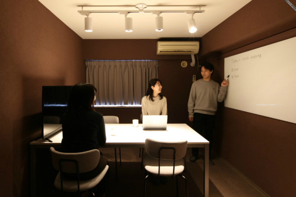 こちらは、グループミーティングルーム。テレビ・ホワイトボードも設置されていて、デジタルなプレゼンテーションも可能。会社と繋いでグループミーティングもできるようになっています。