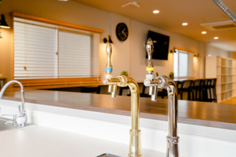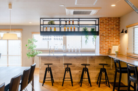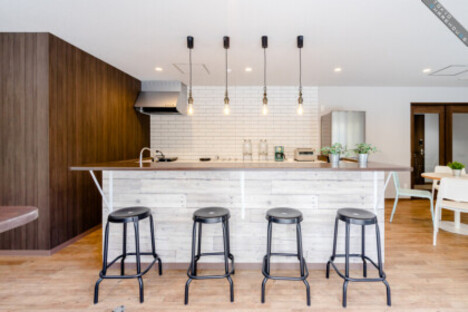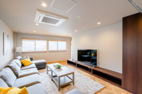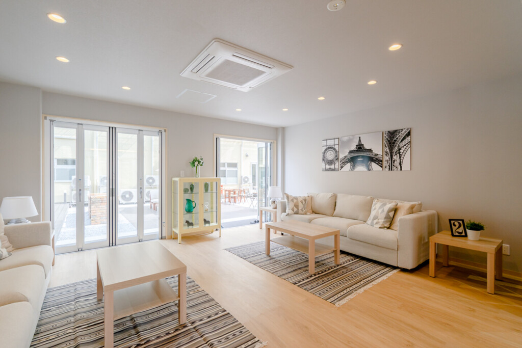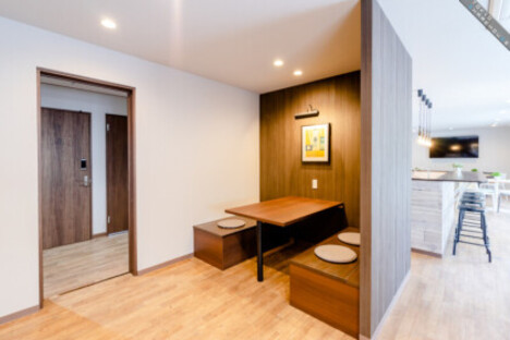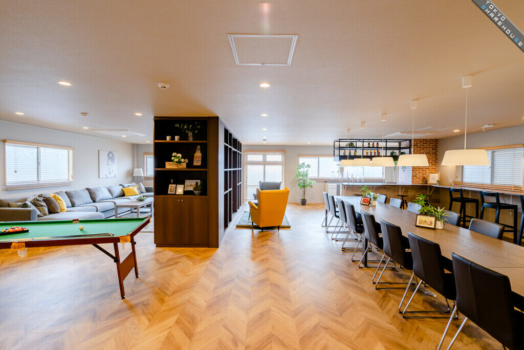 吹き抜ける川の風を感じる、隠れ家シェアハウス。玄関から直結の、広々とした木目調のリビン...