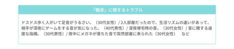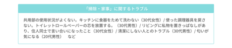 一方で、シェアハウスでトラブル経験がある人の回答を見ると、「騒音問題」「掃除・家事の問題」「人間関係」に関する回答が目立ちました。