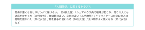 今回はシェアハウスで実際に起きたトラブル内容を見ました。