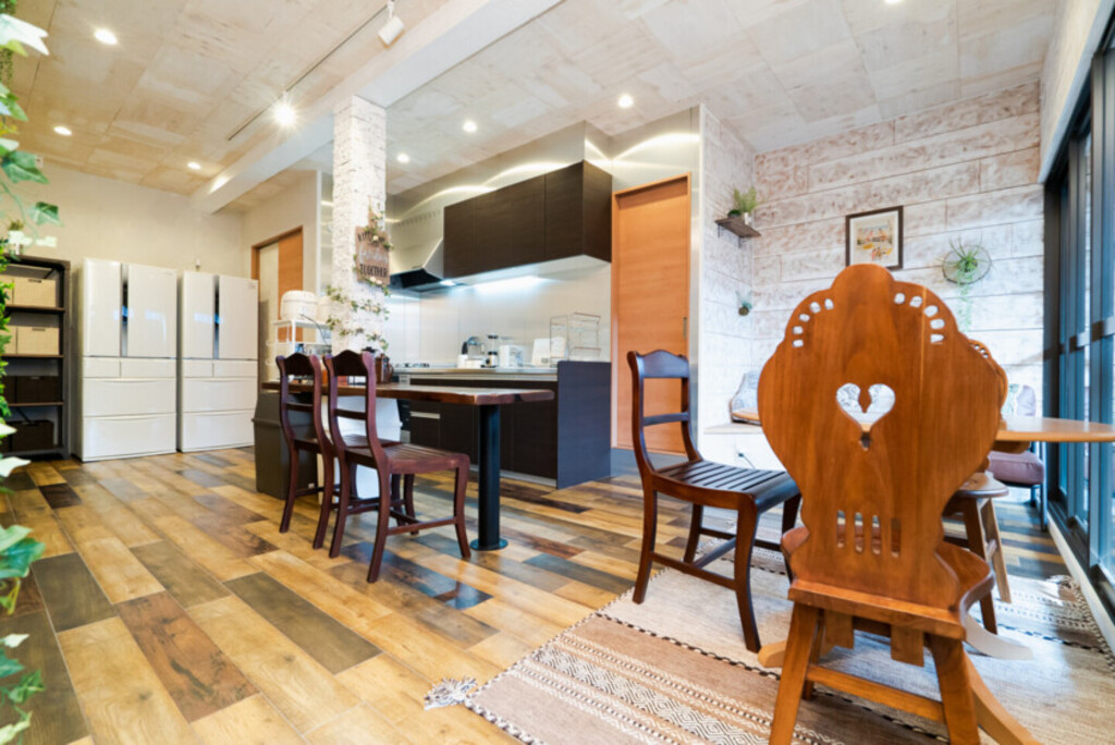 暖炉や、アンティーク家具などを揃え、レトロな雰囲気がありつつも、システムキッチンなど利便性も兼ね備えたシェアハウスです。