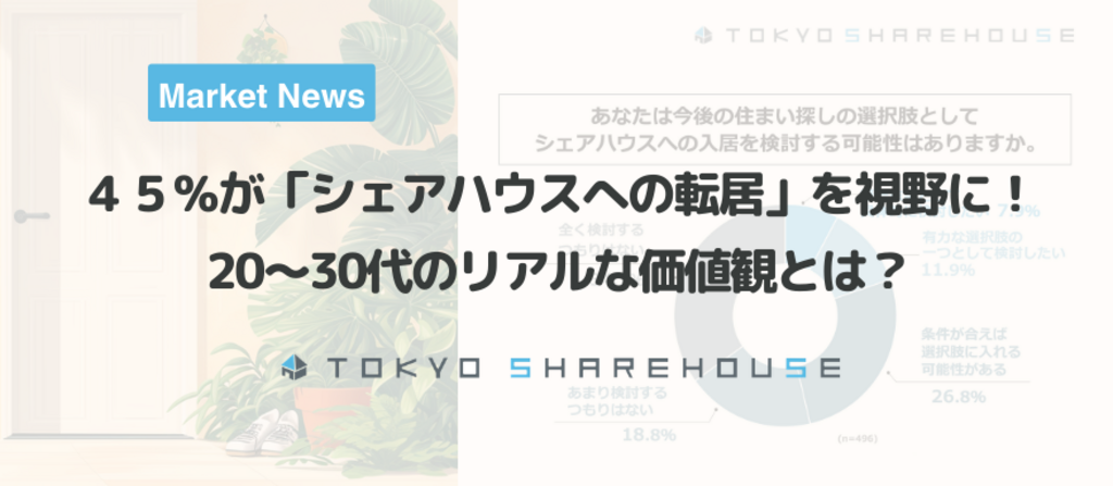 1年以内に引っ越しを検討中の都内在住の20代~30代単身者を対象に「都内の20代~30代単身者の住まいに対する価値観に関する調査」を実施しました。この調査から、1年以内に引っ越しを検討中の都内在住の20代~30代単身者が引っ越しを検討する理由や今後の住まいの選択肢としてのシェアハウスへの入居意向などが明らかになりました。
