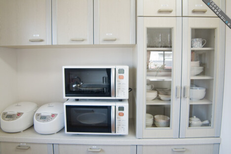 ご覧の通り、炊飯器・電子レンジ・食器もろもろ完備されています。