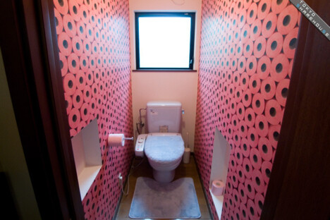 なんともユニークなデザインです。一見すると、大量のトイレットペーパーが積まれているように見えますが、これはクロスのデザインで、本物のトイレットペーパーは1個だけです、笑